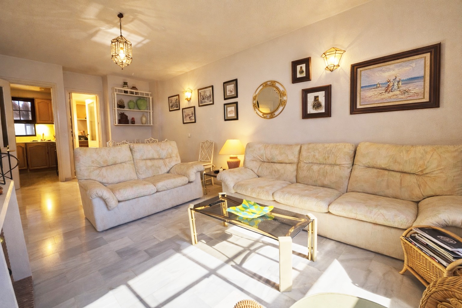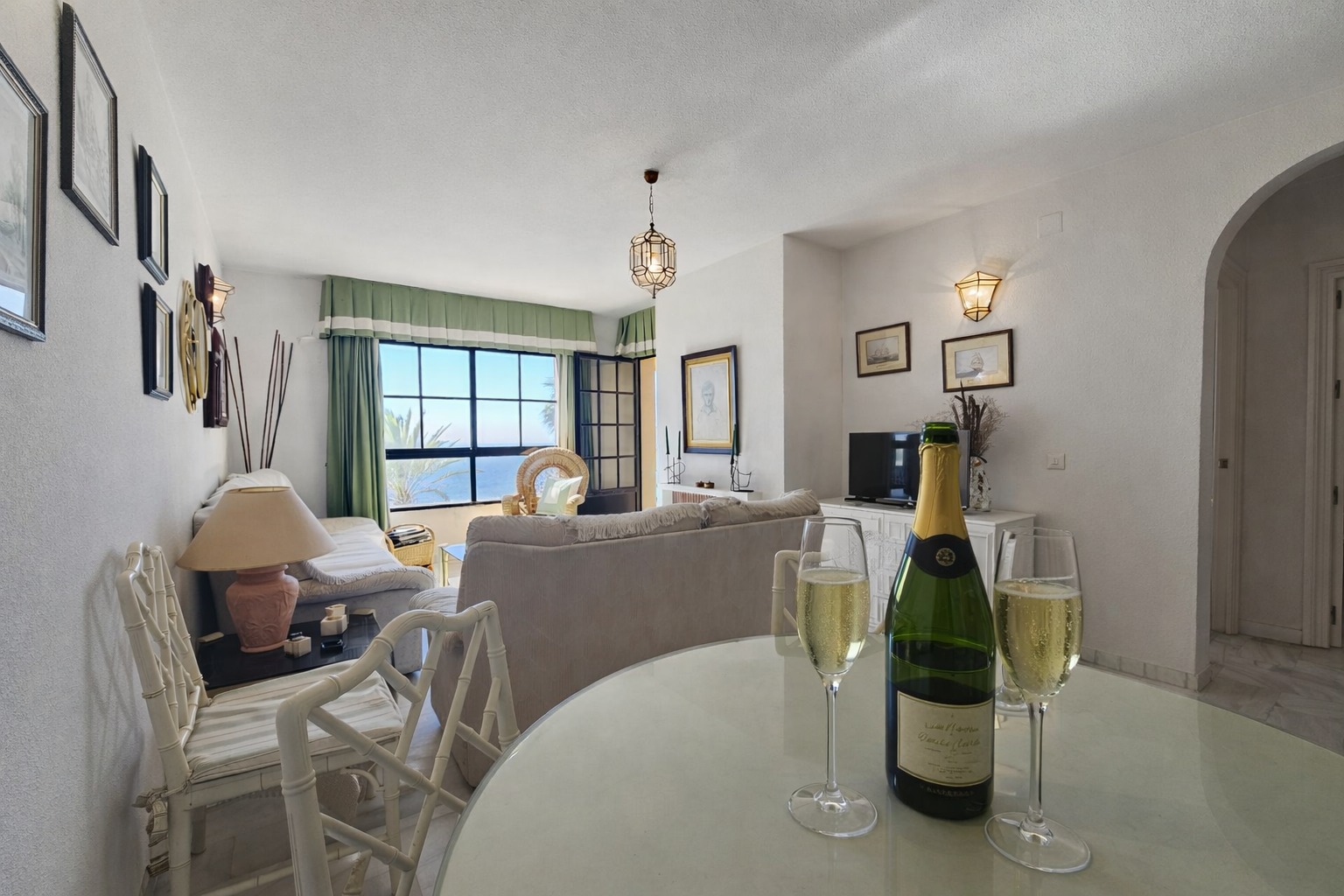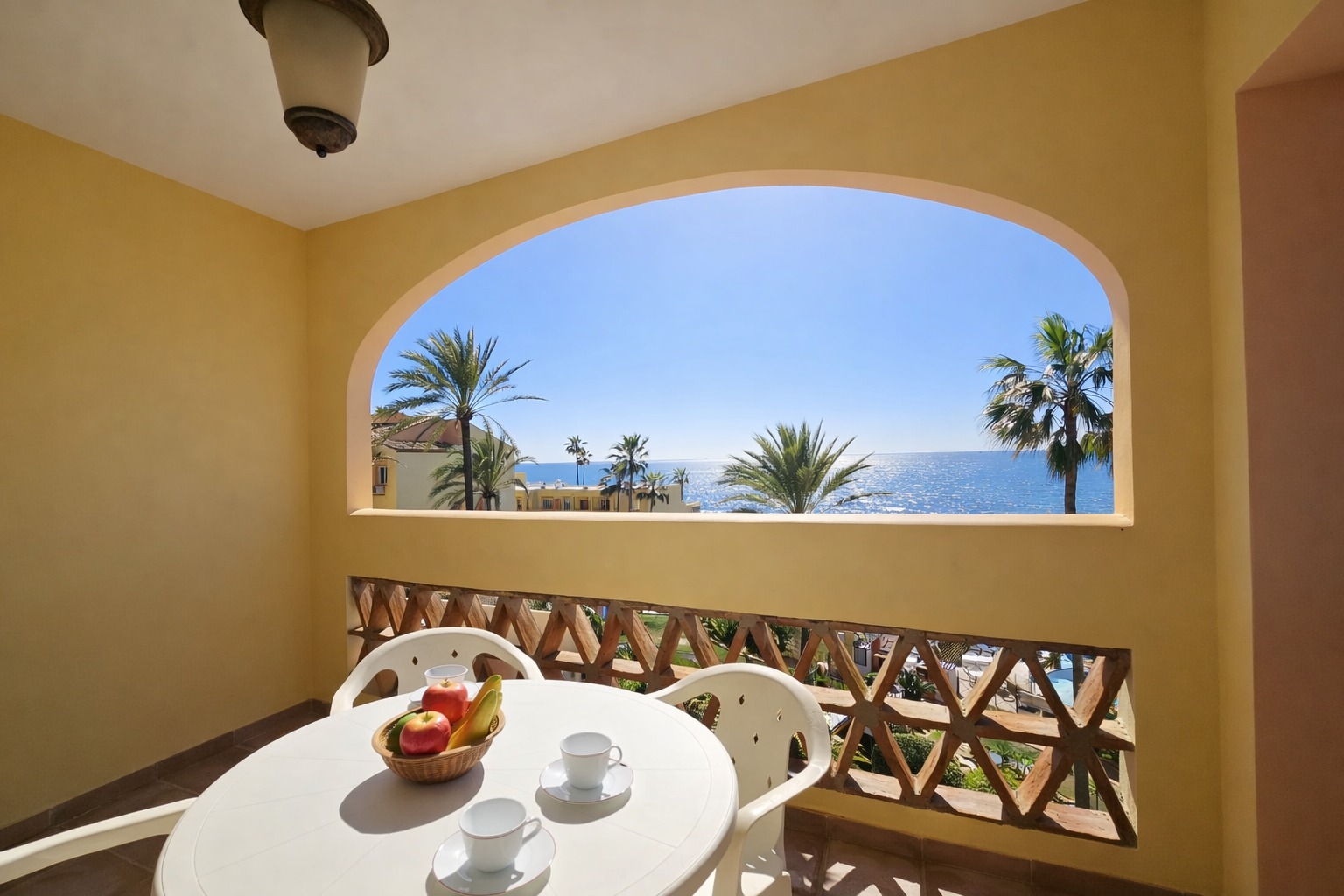 A 2-bedroom, 1-bathroom apartment is offered for sale in the well-known Doña Lola residential complex in Calahonda, frontline to the sea.